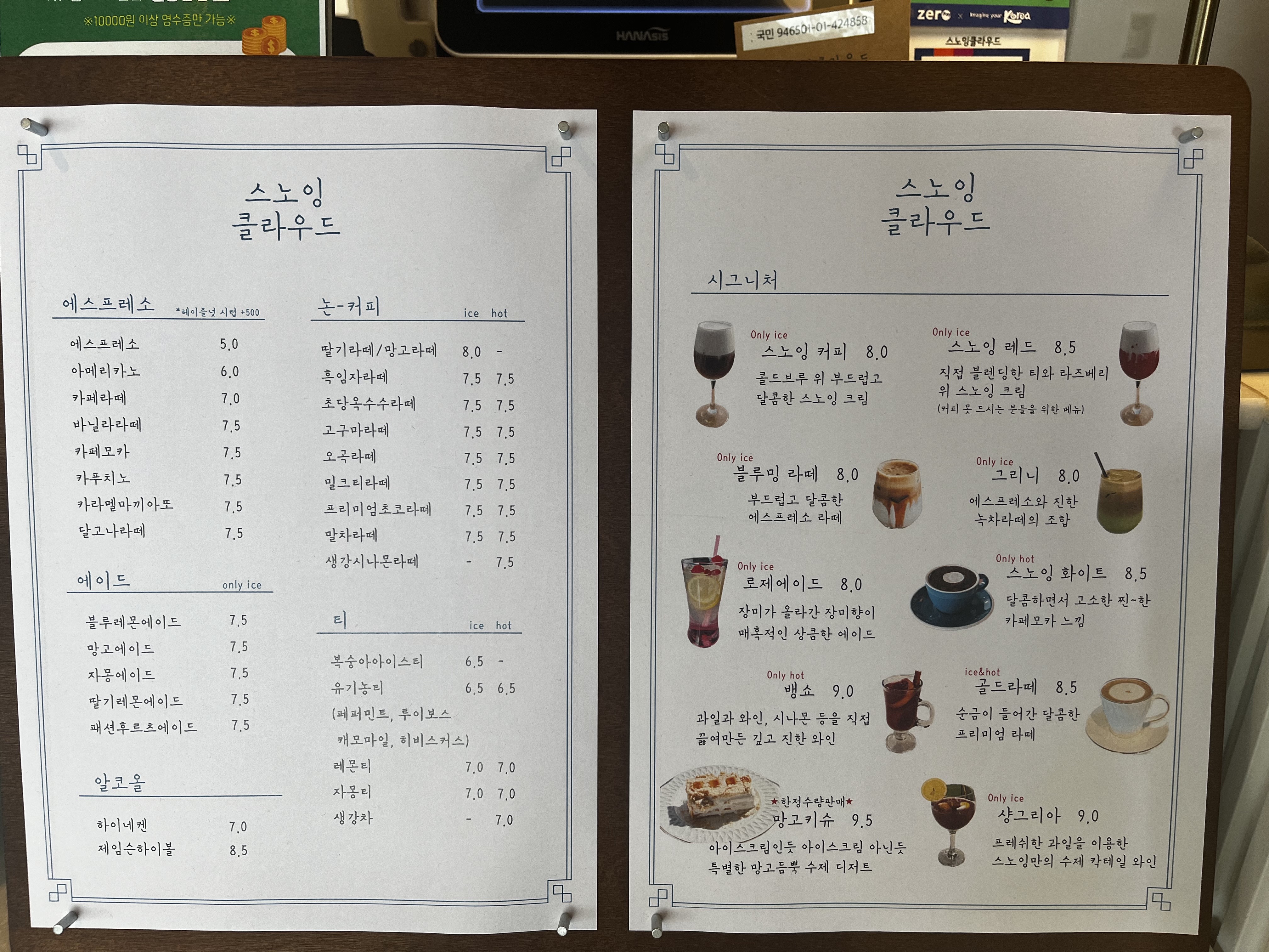 아메리카노 6천원 / 라떼류 7.0~7.5천원